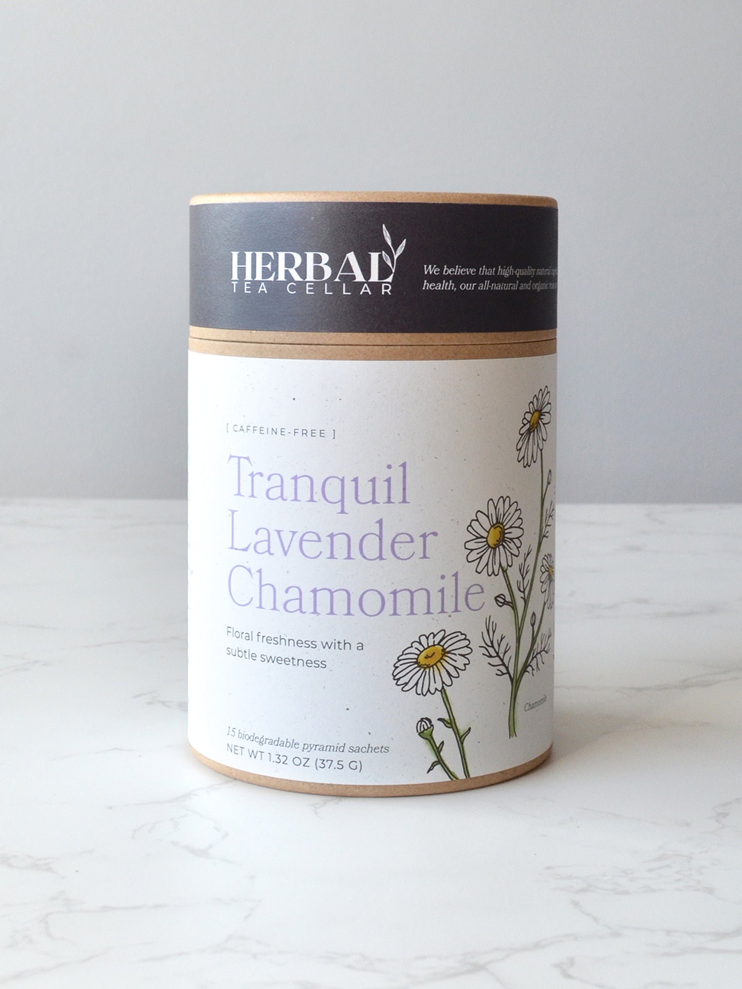 Tranquil Lavender Chamomile is an all-organic, caffeine-free herbal tea that blends floral lavender with gentle chamomile petals, offering a calming cup.